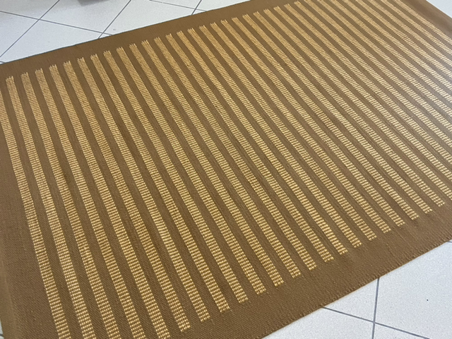 Vékony, kézi szövött gyapjú szőnyeg. Aranybarna, grillázs színek. 135x200 cm, szegett. Erős szövésű, inkább sprődebb tapintású szőnyeg. Személyesen megtekinthető a budaörsi szőnyegboltban.